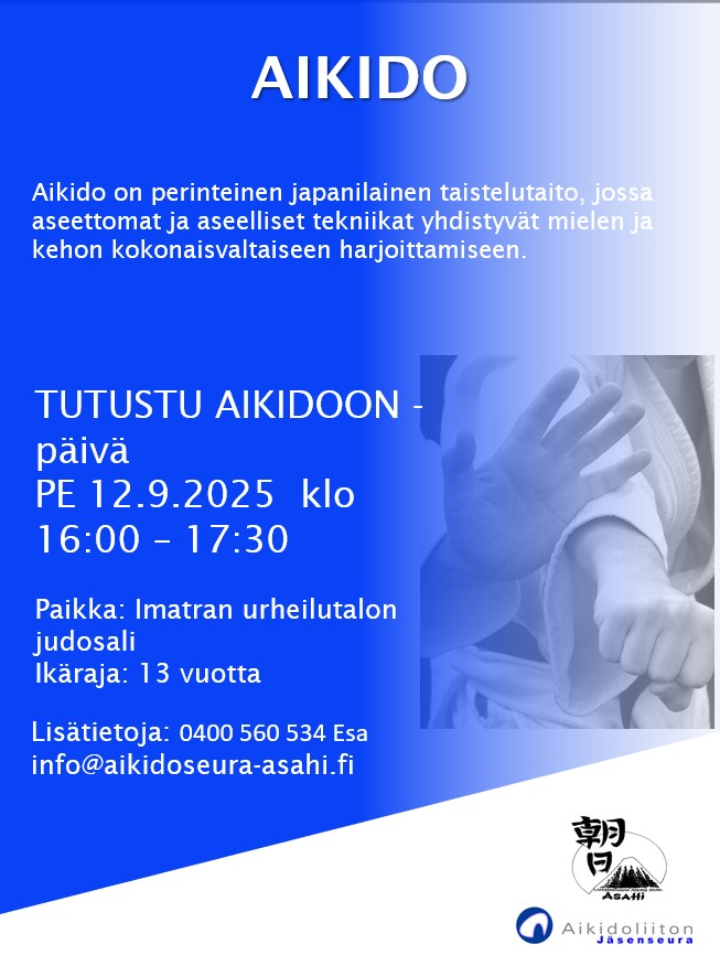 Imatralla aikidoon tutustuminen perjantaina 12.9. klo 16:00- 17:30 välisenä aikana. Voit myös osallistua harjoituksiin.